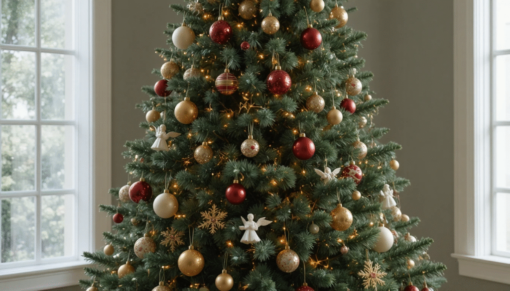 Your Christmas tree is the centerpiece of your holiday decor. Go for a full, lush evergreen tree—real or artificial—and decorate it with classic ornaments, twinkling string lights, and a golden star topper. Choose vintage-style glass baubles, red and gold balls, and delicate angels or snowflakes. Wrap a plaid tree skirt at the base for a cozy, nostalgic finish that brings the entire look together.