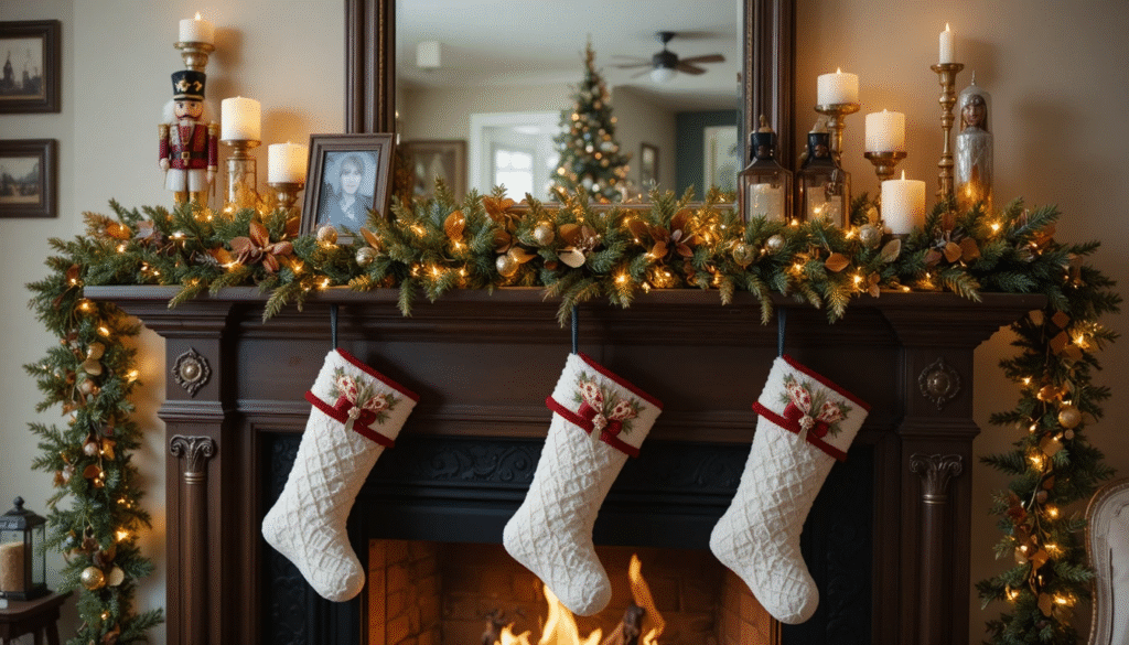 Your mantel is a focal point for festive charm. Decorate it with evergreen garlands, stockings, twinkling lights, and family photos. Add touches of gold or silver candle holders and a classic nutcracker for a nostalgic feel. A mirror or wreath above the fireplace can reflect the light beautifully, giving your living room a soft holiday shimmer.