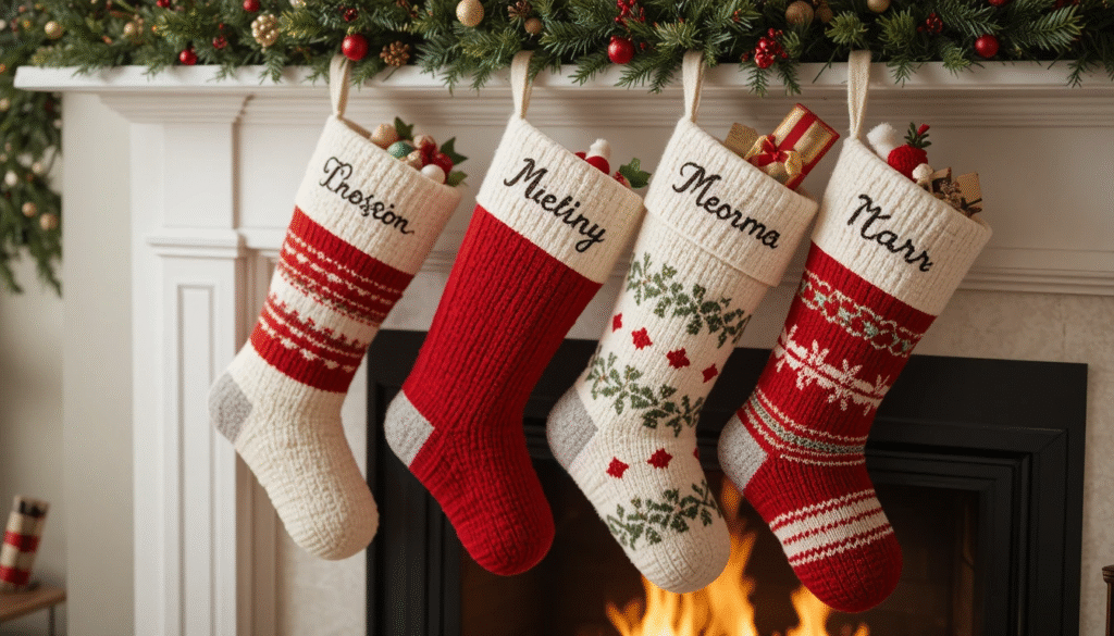 Hanging stockings by the fireplace is a Christmas tradition that never fades. Choose knitted or embroidered stockings in red, white, or plaid patterns. Personalize them with family members’ names or initials for a sentimental touch. Fill them with small gifts, candies, or handwritten notes for a warm surprise on Christmas morning.