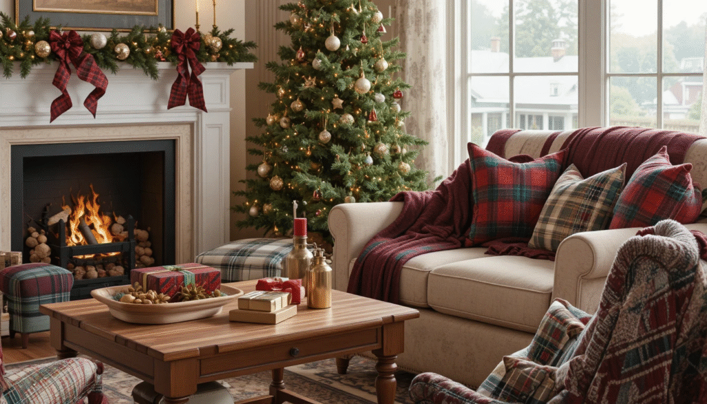 Nothing says “classic Christmas” quite like plaid patterns. Use tartan blankets, cushions, or tablecloths to add warmth and color. A red-and-green plaid throw on a couch or an accent chair instantly makes your space feel cozy and holiday-ready. Even small details—like plaid ribbon on your garlands or gift wrapping—tie your decor together beautifully.