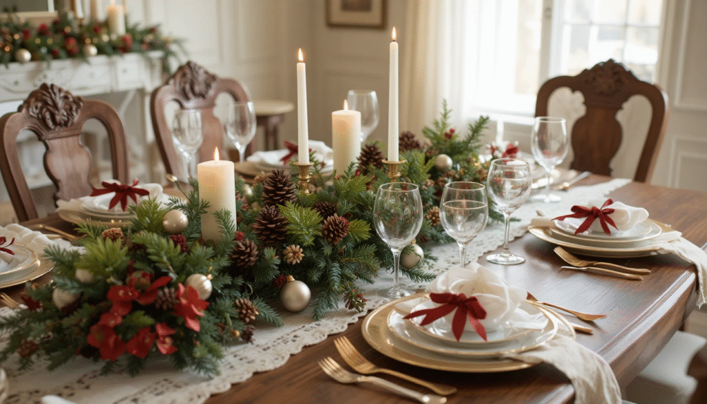 Your dining table should reflect the warmth of the season. Set it with classic china, gold flatware, and linen napkins tied with red ribbon. Add a centerpiece made of evergreens, candles, and pinecones. Scatter a few ornaments or mini wreaths for added charm. The goal is to create an inviting table where loved ones can gather and make memories.