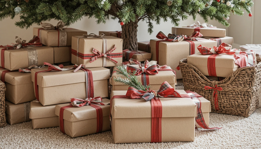 Wrap your gifts early and let them double as decorations. Use kraft paper, red ribbons, plaid bows, and natural accents like twine or pine sprigs. Place the prettiest presents under the tree or stack them in decorative baskets. Not only do they add charm, but they also create excitement for the big day.