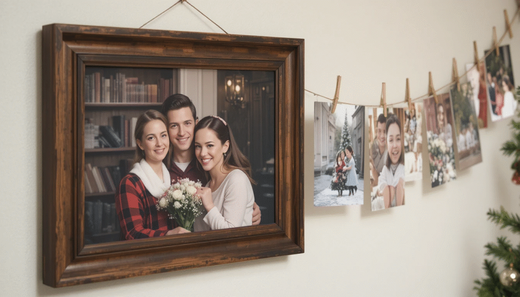 Add a personal twist to your holiday decorating by including family photos, holiday cards, or handmade crafts. Frame cherished moments from past Christmases or hang cards from loved ones on a string across the wall. These sentimental elements make your decor feel truly special and full of love.