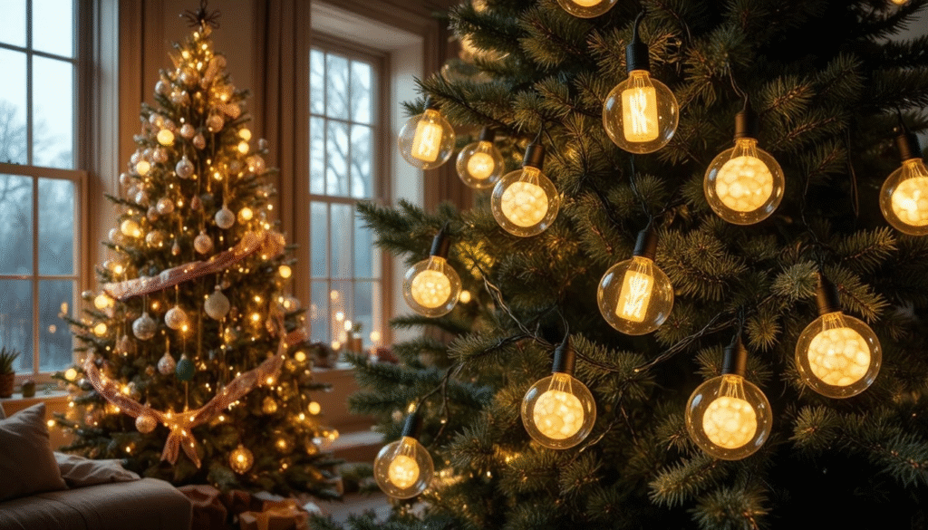 Instead of bright LED lights, try retro-style string lights with larger bulbs that emit a soft, golden glow. These old-fashioned lights instantly make your home feel cozier and more inviting. You can wrap them around your Christmas tree, drape them across windows, or line them along stair railings for a timeless holiday look. Choose multicolored bulbs for a cheerful mid-century vibe or warm white for a rustic, understated glow.