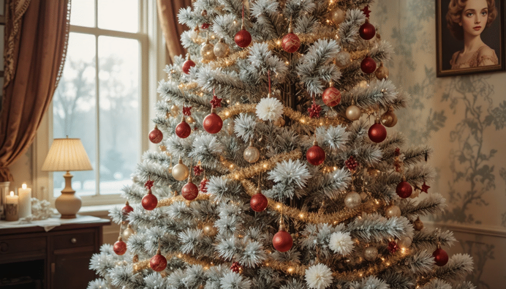 A retro Christmas tree instantly sets the tone for a vintage-inspired space. Try a silver tinsel tree for a glamorous 1950s look or a flocked tree for that snowy, nostalgic charm. Decorate it with classic glass ornaments, tinsel strands, and old-fashioned tree toppers like stars or angels. Add a tree skirt made of velvet or plaid fabric to complete the look.