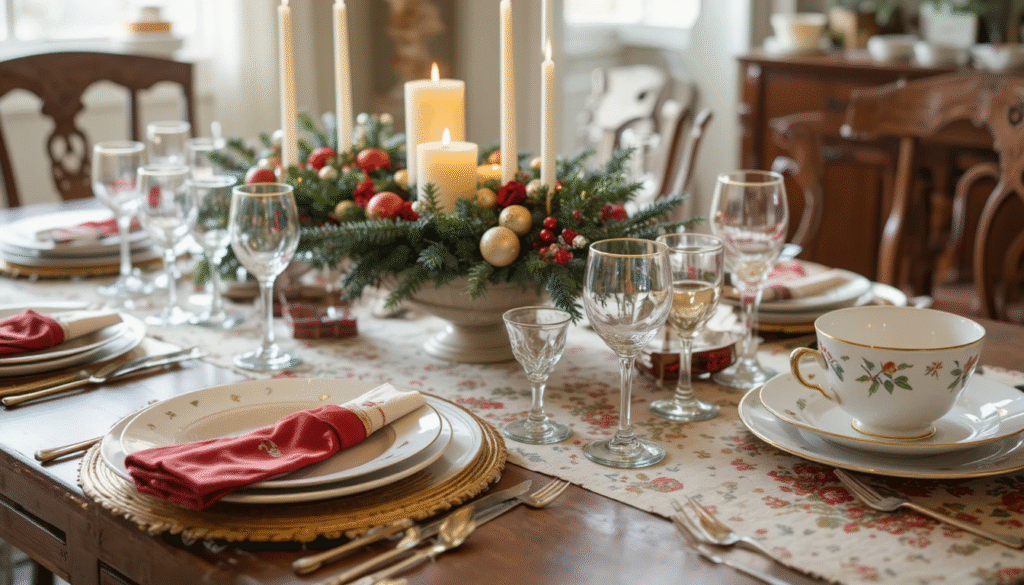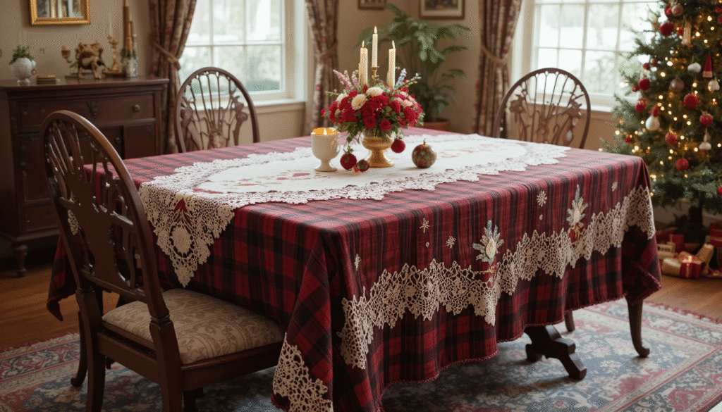 Nothing says vintage Christmas like traditional fabrics and patterns. Add charm with tartan plaids, lace doilies, and embroidered tablecloths. Use vintage linens on your dining table or layer them over side tables for a soft, elegant touch. Quilted stockings and crocheted tree skirts bring that cozy, handmade feel reminiscent of holidays at Grandma’s house.