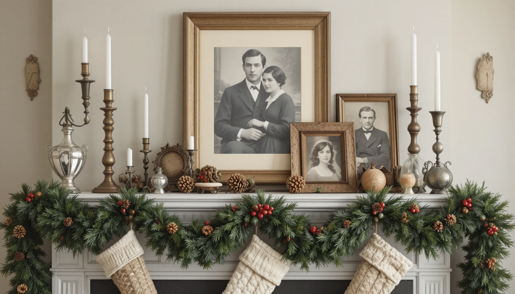 A vintage-inspired mantel can become the centerpiece of your holiday decor. Drape classic greenery garlands mixed with berries and pinecones, then add candlesticks, vintage ornaments, and old family photos in antique frames. Finish the look with knitted stockings or ones made from old fabrics for an authentic nostalgic touch. The combination of texture and history will make your fireplace area feel extra inviting.