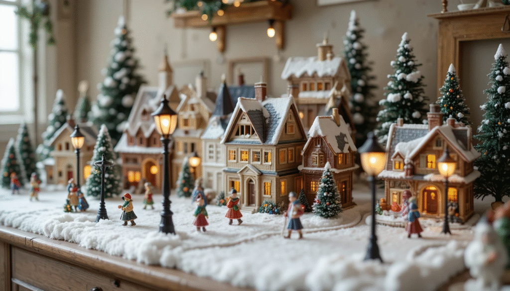 A miniature Christmas village instantly adds vintage charm to your decor. Arrange small ceramic houses, ice skaters, and lampposts to recreate a cozy winter wonderland scene. Light them up with tiny bulbs or fairy lights for a magical glow. These decorative villages not only look enchanting but also capture the whimsy of classic Christmas traditions.