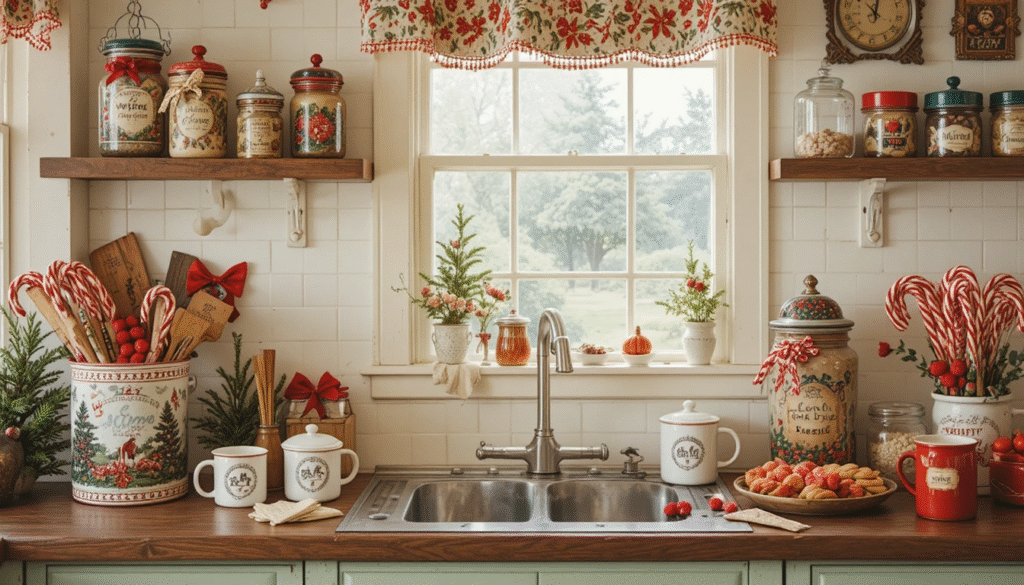 Don’t forget the kitchen! Bring festive nostalgia into this space with vintage cookie tins, enamel mugs, and old-fashioned kitchen towels. Display classic candy canes in glass jars and set up a retro hot cocoa bar. The kitchen often becomes the heart of the home during the holidays, so adding touches of vintage decor helps make every moment feel special.