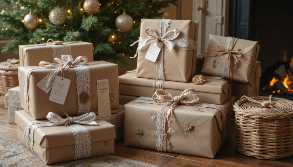 Even your presents can reflect your love for vintage style. Wrap gifts in brown kraft paper, twine, and lace ribbon, or use old-fashioned patterned wrapping paper. Add vintage-style gift tags and wax seals for extra charm. Display wrapped gifts under the tree or in woven baskets near the fireplace for a timeless, picture-perfect presentation.