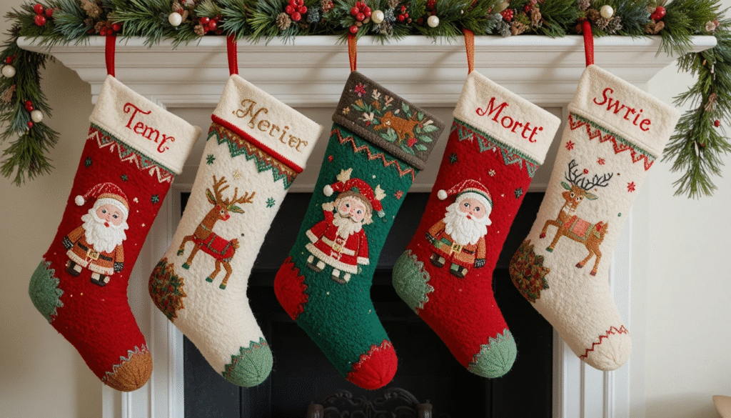Vintage-style stockings bring instant nostalgia. Look for knitted or embroidered stockings in traditional colors like red, green, and cream. Some even feature old-fashioned images of Santa or reindeer. Hang them from your mantel or along the staircase for a warm, homey feel. Mix different textures and designs for a collected, personalized look that feels both charming and authentic.