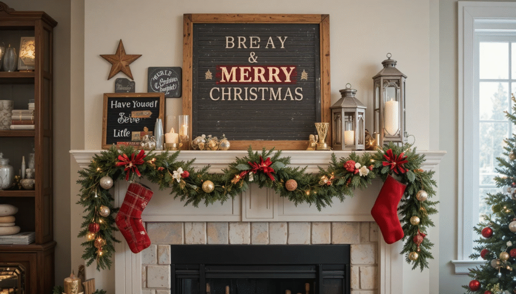 Add a touch of retro cheer with vintage holiday signs or letter boards featuring festive messages. Think phrases like “Merry & Bright” or “Have Yourself a Merry Little Christmas.” You can hang metal or wooden signs above the fireplace, in entryways, or on walls. They add personality and a nostalgic touch that complements other vintage elements.